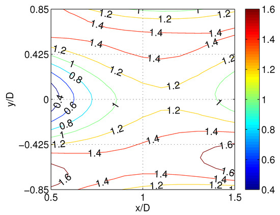 - The flexible plate placed along the centerline showed the lowest root-mean-square in their oscillation amplitude. Furthermore, root-mean-square in amplitude of plate oscillation with respect to their placement behind two side-by-side cylinders appears to be mirrored about the centerline (i.e., at are closer in values to at , and at are closer in values to at ) along a streamwise location. This is further evident from the contour plot showing distribution of behind both cylinders, as depicted in Figure 5.