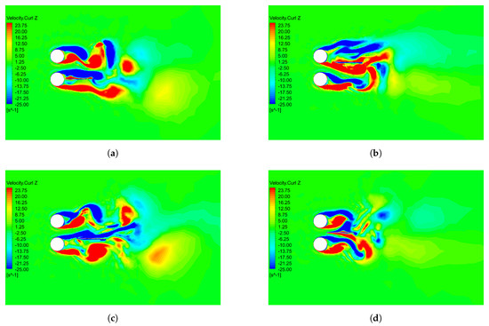 Contour of spanwise vorticity at instance when plate exhibit maximum amplitude for: (a) Case a5; (b) Case b2; (c) Case c4; and (d) Case a3.