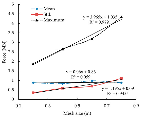 The comparison of the mean, standard deviation, and maximum forces are tabulated in Table 3. The simulated maximum force varies from 1.88 MN to 4.34 MN. Figure 8 shows the mean, standard deviation, and maximum forces varying with the mesh size. It is shown that the simulation with coarse mesh yields higher standard deviation and maximum force. Overall, both the standard deviation and maximum forces present an approximately linear relationship with the mesh size. However, for the mean force, the simulated values with different mesh sizes are around 0.86. The simulated results indicate that the mesh size has a significant effect on both the standard deviation and the maximum loads, while it has a slight effect on the mean load.