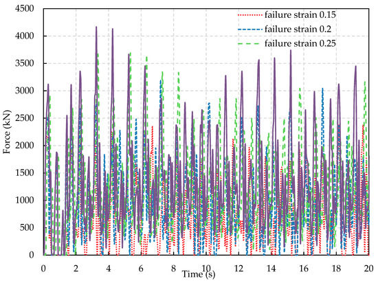 To investigate the effect from the ice failure strain, numerical simulations of the interaction between the level ice and the 3 MW wind turbine tower with different failure strain coefficients are carried out. The values of the ice failure strain in different simulations are set as 0.15, 0.2, 0.25, and 0.3, respectively. The other parameters are kept constant and equal to the basic values according to the setup of test #306 where the drift speed is 1.2 m/s in full scale.