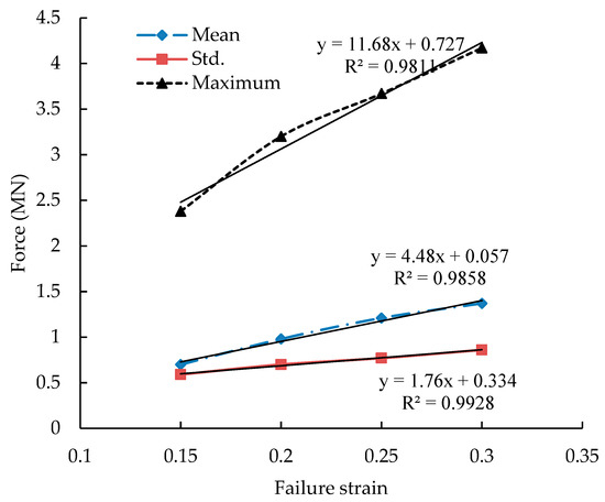The mean, standard deviation, and maximum forces varying with the failure strain.
