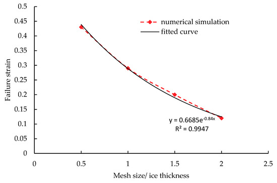 The ice failure strains of 0.43, 0.29, 0.2, and 0.12 are determined for using in the numerical simulations with the mesh size of 0.2 m, 0.4 m, 0.6 m, and 0.8 m, respectively. The relationship between the failure strain and the size ratio is shown in Figure 11. It is observed that the failure strain decreases with increasing size ratio. In this figure, an exponential curve , where and , is fitted to the simulation data. It is shown that the difference between the two curves is small, in which the coefficient of determination R2 is equal to 0.99. The results indicate that can be adopted to describe the relationship between failure strain and size ratio for this case.