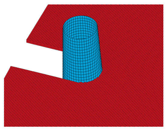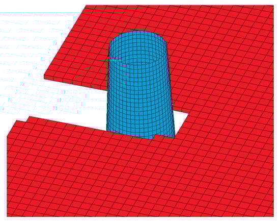 Figure 4 shows the numerical domain of the simulations. The dimensions of the level ice are 55 m × 55 m × 0.4 m. The ice model extent is sufficient to minimize the effect of boundary conditions. The dimensions of the wind turbine towers in the numerical models are the same as the experimental models.