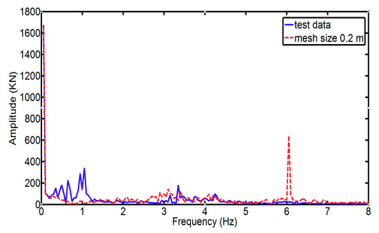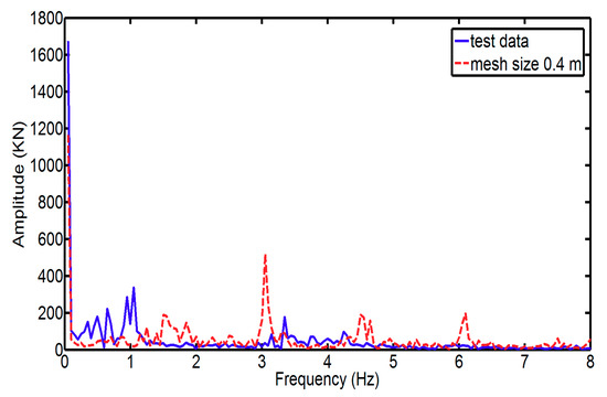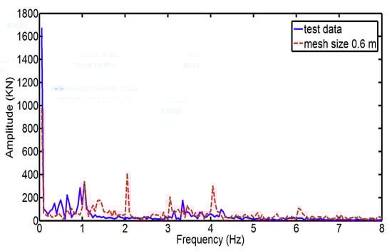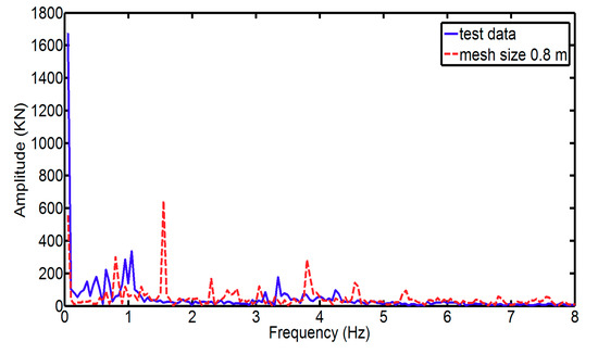 Figure 19, Figure 20, Figure 21 and Figure 22 show the spectra of the ice force from the measurement and simulations with different mesh sizes for test #306. It is observed that the main frequency in the measurement is 1.05 Hz, compared to 6.05 Hz in the simulation with mesh size of 0.2 m, 3.05 Hz in the simulation with mesh size of 0.4 m, 2.05 Hz in the simulation with mesh size of 0.6 m, and 1.55 Hz in the simulation with mesh size of 0.8 m, which indicates that the main frequency in the simulation with larger mesh size is lower and closer to the experimental data. It is noted that there is a good agreement of a peak between the simulation with mesh size of 0.6 m and the measurement at the frequency at 1.05 Hz.