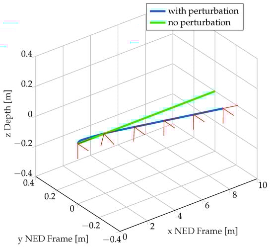 The Figure 7 presents the comparison of the two trajectories (with and without perturbation). One can see the trajectory deviation of the AUV in the plane is around m. This error is because the control is based on a desired velocity vector, not positions with respect to time.