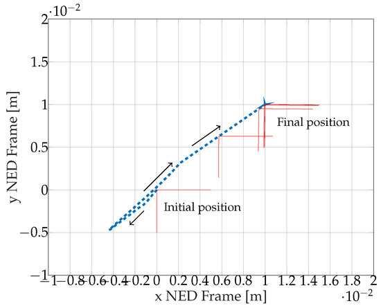 In the Figure 8 are plotted the results from scenario 2. One can observe the transient phenomenon occurring at time t = 1 s on each graph. Figure 8a shows that the linear velocities of the AUV are affected by the sudden perturbation between for s. At t = 5 s, the system succeeds in maintaining a steady state position given the perturbation (see the error value of in Figure 8f). Figure 8c,d display the propeller forces equilibrium, very similar to Figure 6c,d as the system is dealing with the same perturbation. The Figure 9 displays the plane displacement of the AUV during the maneuver. As in the previous scenario, the final position error is about 1·10 m in each direction.