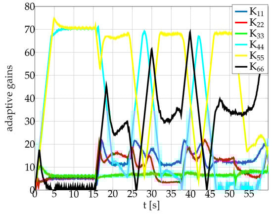In Figure 11 and Figure 12 are plotted the adaptive gains and the corresponding error variables . It is easy to notice that the adaptive control is constantly compensating the perturbation, especially during the heading changes as the water current relative direction with respect to the AUV body-fixed frame changes (see the gains and , in blue and red associated with the degrees of freedom x and y). Furthermore, the gain (z degree of freedom) adapts during the three phases when diving velocity is required to change.