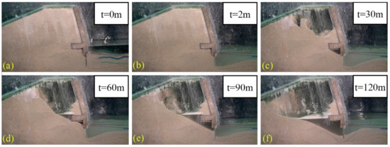 Scour and the outflow in a dike model. The dike model was filled with sand (a). When scour depth in front of the dike reached the lowest edge of the dike (b), the backfilling materials flowed out, and the cave was formed (b–f). t denotes the elapsed time (unit is minute).