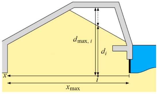 where Cx is the reduction coefficient for the inner length inside the structure; x is the inner horizontal length at the lowest edge from the front of the structure (refer to Figure 2); and xmax is the total horizontal length at the lowest edge of the structure.