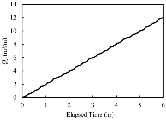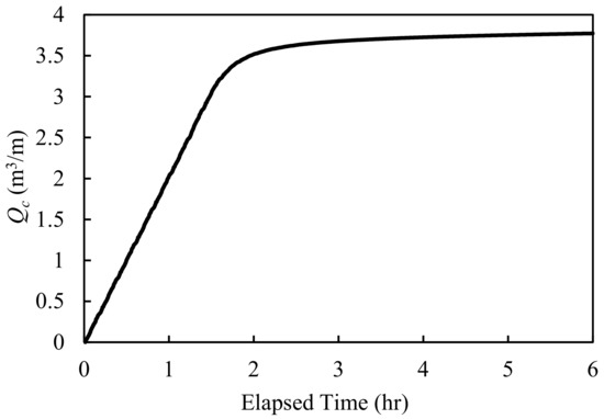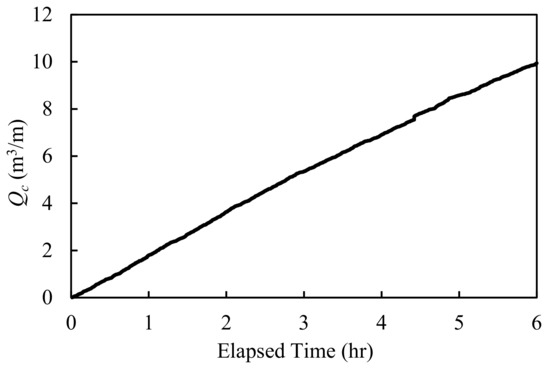 The results show that the outflow rates were a constant value, regardless of the simulation time. This is because the total amount of the outflow volume was small compared to its size. According to Equations (9) and (10), the reduction coefficient, Cd, depends on changing the layer thickness of the backfilling materials. At the front of the structure, where x/xmax = 0, the coefficient is a constant value of 1 when the parameter d/dmax is greater than 0.14. Therefore, since changes in the thickness were small, the coefficient became a constant value, resulting in constant outflow rates.