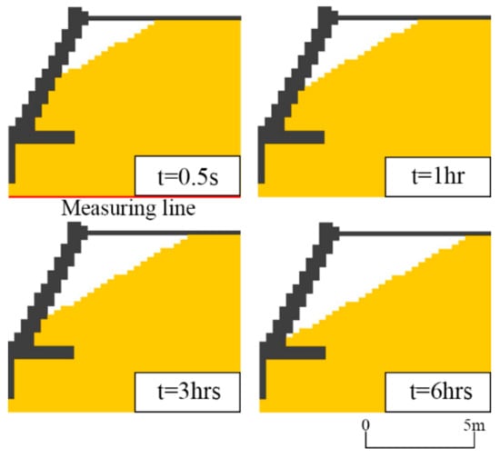 2) Determine the measuring line at the lowest edge of the structure. This line should be around 1 to 3 meshes below the lowest edge of the structure. The vertical length from this line to the elevation of the backfilling surface in each mesh is defined as dmax,i for the initial time and di for the other, where i is the mesh number in the horizontal direction. This line is also used as the datum line to calculate the static water pressure in Equation (12).