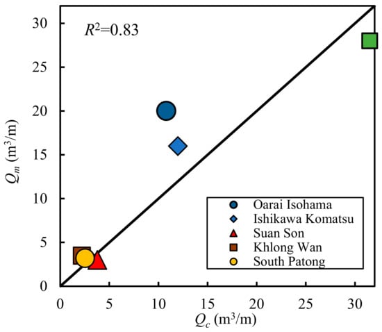 The reliability of the model is confirmed by comparing these simulated results to the measured values from the same reports. A correlation graph consisting of the simulated results of the authors and Silarom et al. [9] was created, as shown in Figure 9. This graph shows that the present model could calculate the outflow rates with acceptable accuracy (R2 = 0.83). The simulated results for the Oarai–Isohama Coast and Ishikawa–Komatsu Coast were underestimated because the effect of cracks on these structures were not considered.