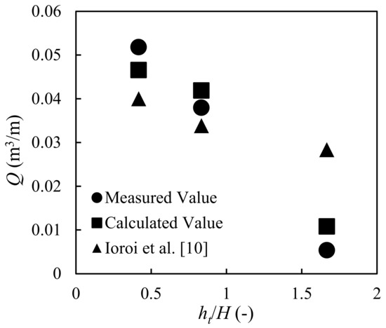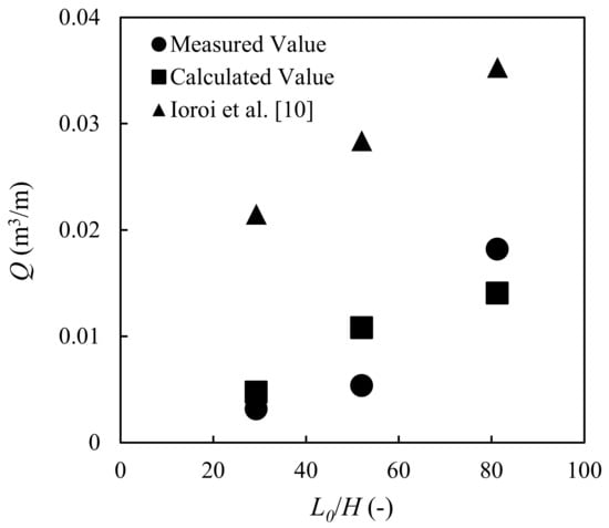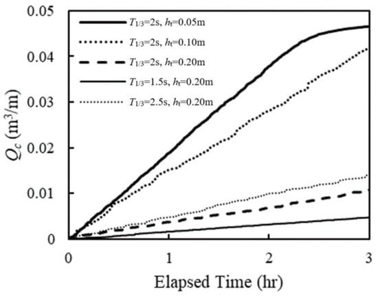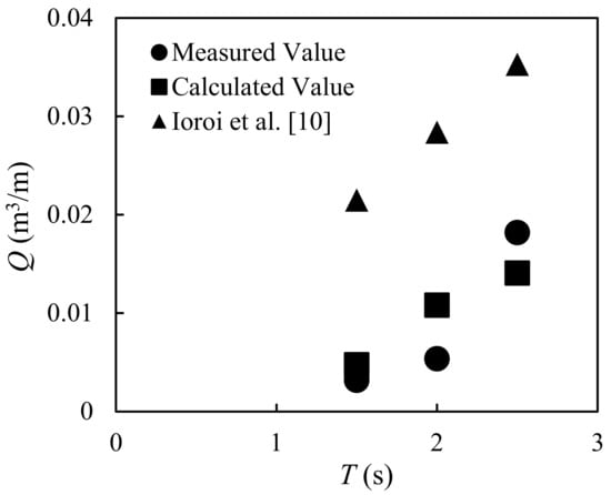 The experimental results are shown in Figure 11 and Figure 12. The results indicate that the outflow volume increases when the wave period increases and decreases when the water depth increases. These trends are similar to those of the maximum scour depth in front of a seawall (e.g., in [15,16]). By considering the wave periods in terms of wavelengths in deep water, the results shown in Figure 13 were obtained. The results show that the outflow rate is proportional to the wavelength in deep water, which is a function of T2 (L0 = gT2/2π).