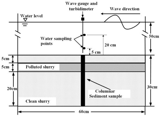 A total of 567 g Cu (NO3)2·3H2O was dissolved into 8.5 kg of standard sea water to produce a heavy metal solution, which was subsequently well mixed with 30.0 kg of sieved dry soil to form a uniform polluted slurry with a water content of 30%. The slurry was sealed in darkness for seven days to the ensure Cu reached a stable state. Clean slurry was prepared with sieved dry soil and standard seawater. In order to eliminate the effect of wave orbital shear stress on the resuspension of polluted sediment particles, the polluted slurry was designed to be covered by a layer of clean slurry. The clean slurry was first backfilled into the soil tank until a depth of 20 cm. Then, a uniform 5 cm thick layer of polluted slurry was deposited above the clean slurry. Another 5 cm thick layer of clean slurry was finally laid on the top. Standard seawater was then gradually added into the wave flume up to a depth of 50 cm above the soil surface (Figure 3).