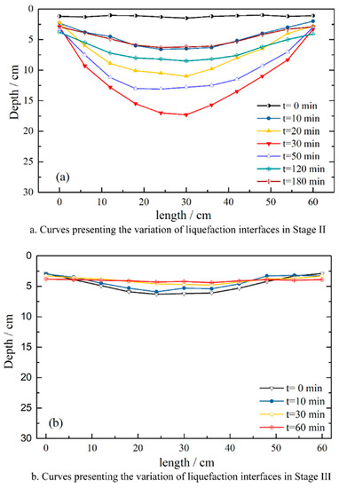 Curves presenting the variation of liquefaction interfaces in Stage II (a) and Stage III (b).