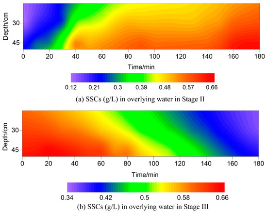 The SSCs in the overlying water under wave actions in Stage II and Stage III were presented in Figure 5. There was a rapid increase in the SSC after loading the 7 cm height wave, and the SSC reached a relatively stable state after approximately 60 min of wave action. During Stage II, the SSC increased significantly, the variation range was 0.118–0.643 g/L. While in Stage III, the SSC first increased slightly, then gradually decreased, and the variation range was 0.357–0.656 g/L. The SSCs at 5 cm above the sediment surface were higher than those at 20 cm above the sediment surface, this agreed well with results in the study of Kong and Zhu [36], which found that SSC increased with water depth under wave action in a wave flume experiment. Moreover, the SSCs at the two sampling points showed similar variation trend.