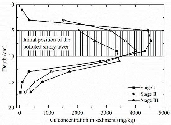 At the end of Stage I, there was little change in the Cu concentrations in the sediment. As presented in Figure 7, slight increase of Cu content was observed in the sediment above the polluted layer, while a relatively larger increase was found below the polluted layer. Since there was a concentration gradient between the polluted slurry and the clean slurry, Cu in the polluted layer diffused into the surrounding layers through pore water [41]. Furthermore, the downward diffusion amount was larger under the effect of gravity.