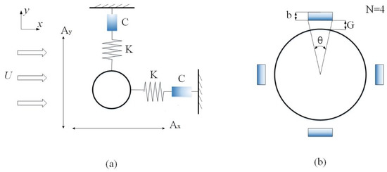 The two degrees of freedom (2-DOF) VIV system consists of a circular cylinder, two springs and two dampers, as shown in Figure 1a [1]. The VIV response of streamwise vibration and transverse vibration are all considered, and the cylinder is free to vibrate in the x-direction and the y-direction. The vibration suppression device is the axial-slats having an omnidirectional suppression effect, and thus the rotation response is not shown in this study. C is the system damping, and K is the spring stiffness. Ax and Ay are the displacements in the x-direction and the y-direction. D is the diameter of the cylinder. The distribution of the axial-slats is symmetrical to the x-axis, and there is always one above the cylinder and one below the cylinder. Figure 1b is the schematic diagram of a circular cylinder with axial-slats, where θ is the coverage angle of an axial-slat, b is the width of the axial-slats, G is the spacing between the main cylinder and the axial-slats and N is the number of axial-slats. According to the previous studies [6,22], the width is set to b = 0.02D, and the coverage angle of an axial-slat (N = 1) is set to θ = 0.025∙2π. The axial slats are attached to the cylinder and vibrate with the cylinder.