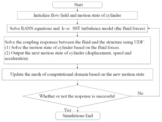 The above method is achieved by embedding user-defined functions (UDFs, programmed in C language) into the popular finite-volume code ANSYS FLUENT. Firstly, the fluctuating hydrodynamic forces are calculated by solving 2D-RANS equations in conjunction with the SST k-ω turbulence model. The total hydrodynamic force is the integration of the total stress (the pressure and the viscous stress) around the cylinder and the slats. Based on the forces, the displacement, velocity and acceleration at time t + ∆t are solved in UDFs. Finally, the mesh is updated based on the displacement of the motion. The process of VIV response is realized by the above method, and the process of the numerical simulation is shown in Figure 2 [1].