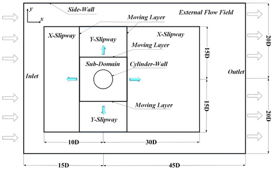 The diagram of computational domain is shown in Figure 3 [1]. The entire computational domain is divided into four regions, including Sub-Domain, Y-Slipway, X-Slipway and External Flow Field. Since the amplitude of motion may be high, the lengths of the computational domain in the x-direction and y-direction are 60D and 40D in all cases. The entire domain includes four kinds of boundaries, which are inlet, outlet, side-wall and cylinder-wall. The Sub-Domain is 6D × 6D, the Y-slipway is 6D (the streamwise direction) × 30D (the transverse direction) and the X-slipway is 40D (the streamwise direction) × 30D (the transverse direction). The center of the cylinder (the original point) is 15D away from the upstream boundary (inlet), and the upstream boundary is imposed with a velocity inlet condition, where u = u∞ (the streamwise direction) and v = 0 (the transverse direction). The center of the cylinder is 35D away from the downstream boundary (outlet), and the downstream boundary is an outlet condition with ∂u/∂x = 0 and ∂v/∂x = 0. The two lateral boundaries (side-wall) are 20D away from the x-axis, and the lateral boundary is the symmetry condition with ∂u/∂y = 0 and v = 0.
