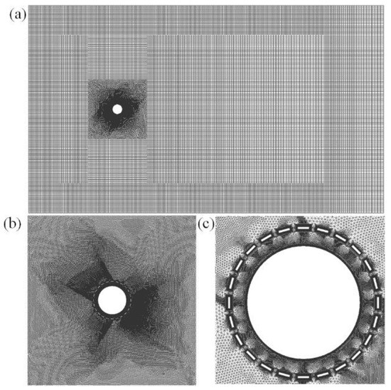 The density of the mesh can affect the prediction accuracy of the numerical model. The minimum edge of the axial-slats requires at least 10 cells to improve the resolution of the structure. The number of meshes is increased by increasing the number of cell nodes along the edge of the structure. Finally, the grid independence verification was conducted using different grid densities, including 30,000 (M1), 60,000 (M2), 90,000 (M3), 120000(M4) and 150,000 (M5). As shown in Table 2, the percentages in brackets were changes in the ratios of Ay/D and f/fn relative to the corresponding values for the former grid. When the mesh resolution was refined from M4 to M5, the differences of Ay/D and fy/fn were reduced to 0.05% and 0.04%. The difference between the two meshes of M4 and M5 was less than 0.1%, and the mesh of M5 could be used [19]. Therefore, the number of meshes in the simulation was set to about 150000. The mesh (M5) is shown in Figure 4 when ε = 60% and δ = 0.15 D. The non-dimensional time-step (U∙∆t/D, U is flow velocity) was set as 0.001 to keep the Courant–Friedrichs–Lewy (CFL) number being less than 1 [19].
