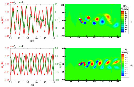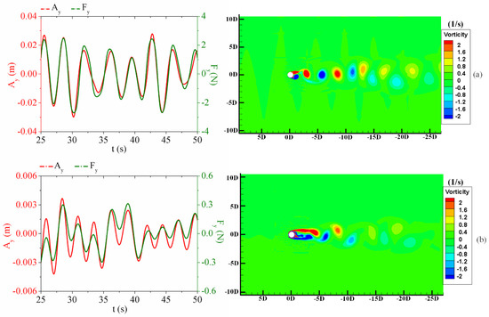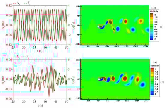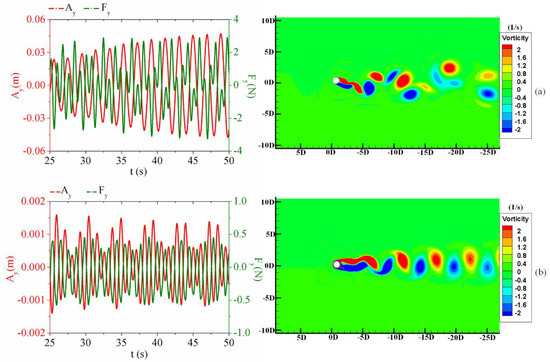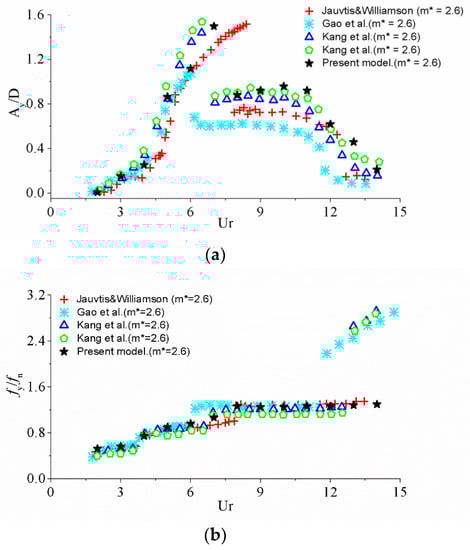 Before the numerical simulation is carried out, the prediction accuracy of numerical model must be verified by the experimental results [23] and other CFD results [12,24]. The main parameters are presented in Table 1. The VIV response of a cylinder is numerically simulated in the range of 2 < Ur (reduced velocity, ) < 14, as shown in Figure 5. The frequency of vibration is calculated by fast Fourier transform (FFT) of the displacement.