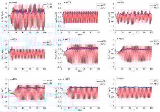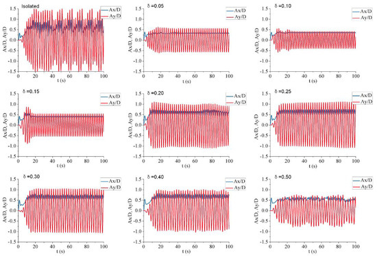 The time histories of amplitude responses of a circular cylinder with different coverage ratios of axial-slats (Re = 2.8 × 104 and δ = 0.15) are shown in Figure 6. For isolated cylinder, the cross-flow amplitude ratio was close to 1.5, which is also found in the experiments by Jauvtis and Williamson [24] and is called “super upper” branch. Due to the effect of the axial-slats, the in-line amplitude ratios were effectively suppressed. Especially for ε = 30%, the amplitude ratio was close to 0. As coverage ratio increased, the suppression effect was different. Especially for ε = 30%, the amplitude ratio was close to 0.5, which was about 66.7% lower than that of the isolated cylinder.