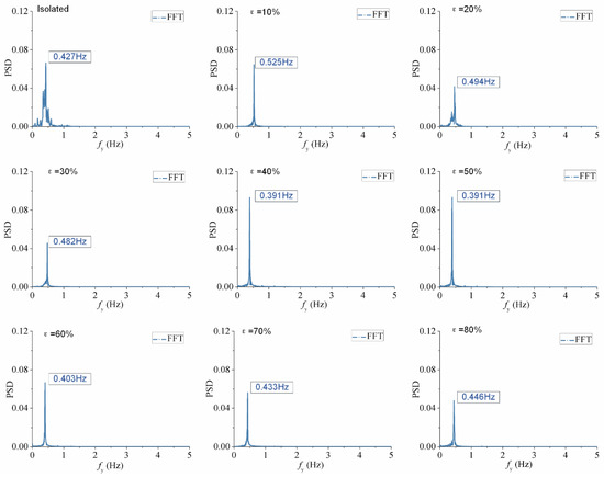The frequency ratios of a circular cylinder with different coverage ratios of axial-slats (Re = 2.8 ×104 and δ = 0.15) are shown in Figure 7. PSD is the power spectral density of the signal. When ε = 10%, the vibration frequency is the maximum value. Then the vibration frequency shows a downward trend. When ε = 40% and ε = 50%, the vibration frequency was the minimum value (fy = 0.391 Hz), which was close to the natural frequency of the isolated cylinder (fn = 0.4 Hz). The cross-flow amplitude ratio was close to 1.0 for ε = 40%, which was about 33.3% lower than that of the isolated cylinder. The different coverage ratios of axial-slats result in different effects on the frequency of vortex shedding. When ε = 40% and ε = 50%, the frequency of vortex shedding approached the natural frequency of the structure and resonance phenomenon occurs. When ε ≥ 50%, the vibration frequency gradually increased.