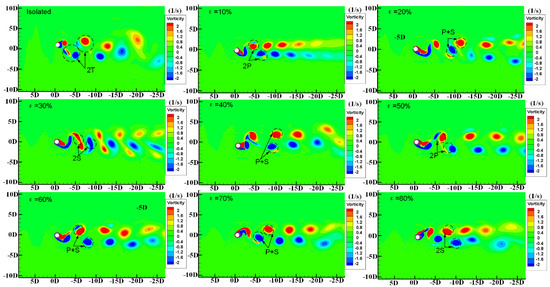 The vorticity contours of a circular cylinder with different coverage ratios of axial-slats (Re = 2.8 × 104 and δ = 0.15) are shown in Figure 8. The unit of vorticity intensity is 1/s or s−1. For an isolated cylinder, a typical 2T mode (2T mode means that three vortices shed per half cycle) is observed, which was also observed in the experiments by Jauvtis and Williamson [23]. The vortex pattern was changed due to the existence of axial-slats. The vortex pattern was unstable for ε = 40%, and the 2S mode (2S mode means that two single vortices shed per cycle) was observed in the wake region near the structure. However, the 2S mode gradually changed to the P + S mode in the wake region away from the structure (P + S mode means that three vortices shed per cycle) because the axial-slats destroyed the vortex street. When the coverage ratios of axial-slats were different, the levels of damage of the vortex streets were different. The vortex street was destroyed, which was helpful to suppress structural vibration. For ε = 10%, a typical 2P mode (2P mode means that two vortex pairs are formed per cycle) was observed.
