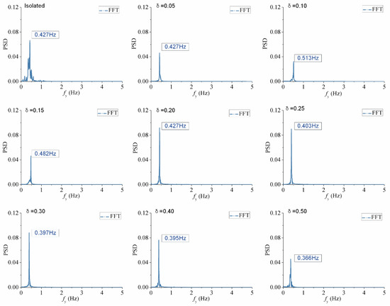 The time histories of amplitude responses of a circular cylinder with different gap ratios of axial-slats (Re = 2.8 × 104 and ε = 30%) are shown in Figure 9. Due to the effect of the axial-slats, the in-line amplitude responses were effectively suppressed. Especially for δ = 0.05, δ = 0.10 and δ = 0.15, the in-line amplitude ratios were close to 0. When δ > 0.15, the suppression effect was weakened. For δ = 0.05, δ = 0.10 and δ = 0.15, the cross-flow amplitude ratios were close to 0.5. The cross-flow amplitude ratio was about 0.45 for δ = 0.10. The cross-flow frequency responses of a circular cylinder with different gap ratios of axial-slats (Re = 2.8 ×104 and ε = 30%) are shown in Figure 10. When δ = 0.10, the vibration frequency was the maximum value, which was 0.513 Hz. The vibration frequency began to decrease when δ > 0.10. When δ = 0.25 and δ = 0.30, the vibration frequency was close to the natural frequency of isolated cylinder (fn = 0.4 Hz) and the suppression effect was weakened.