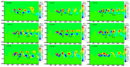 The vorticity contours of a circular cylinder with different gap ratios of axial-slats at Re = 2.8 × 104 and ε = 30%.