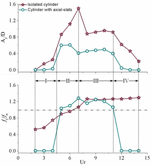 Figure 12 shows comparisons of VIV responses of isolated cylinder and cylinder with axial-slats (δ = 0.10, ε = 30%). Based on the VIV response, the whole VIV response region was divided into four regions.
