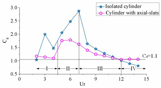 Mean drag coefficient versus reduced velocity of isolated cylinder and cylinder with axial-slats (δ = 0.10, ε = 30%).