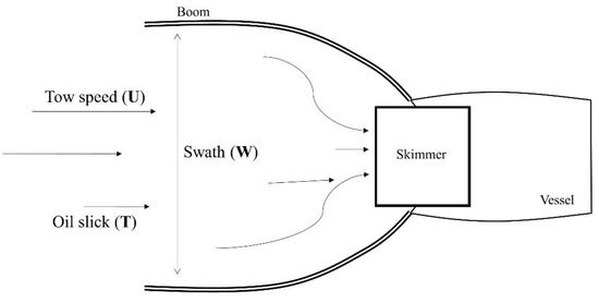 Figure 1 shows a schematic of a typical mechanical recovery system used to recover oil spills at sea. The recovery system includes an oil boom for capturing the oil, a skimmer for recovering the oil, and a vessel for providing advancing velocity [14]. The effectiveness of the recovery system is a measure of how much oil can be recovered from the sea surface through the given set of resources during an allocated operating time [14]. The overall performance of the recovery system depends on the performance of each component, such as the oil boom and the skimmer.