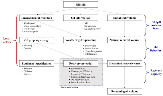 The equipment specifications, oil behavior, and environmental conditions are critical factors in estimating the recovery potential. The boom specifications (i.e., type, draft, B/W ratio, and swath) and the skimmer specifications (i.e., type, nameplate capacity, and skimming speed) were considered. The oil behavior, such as spreading and weathering processes, was calculated every hour. Furthermore, the environmental conditions, including wind speed and waves, were considered. The currents could be considered using the relationship between the current velocity and the tow velocity of the skimmer. The recovery system removes the oil mechanically from the sea surface. Therefore, the remaining oil volume can be estimated by considering both mechanical recovery by skimmers and natural removal processes by evaporation and dispersion. In this calculation process, the focus was given toward improving the recovery potential. The loss factors of Figure 2 were regarded to be factors representing the equipment specifications, oil behavior, and environmental conditions.