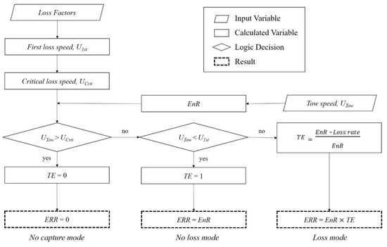 The detailed procedure for calculating ERR, using the developed correlations for the loss speed and the loss rate, is illustrated in Figure 3. EnR can be calculated for a tow speed of the skimmer, UTow. Furthermore, the first loss speed, U1st, and the critical loss speed, UCrit of the boom, can be calculated using the developed correlations in terms of wave steepness, oil density, draft, and B/W of the boom. ERR can be estimated by calculating TE based on the loss speeds and the loss amount per unit time.
