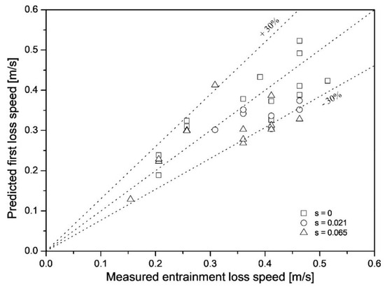 Comparison of predicted first loss speed to measured entrainment loss speed, based on Equation (6) and the measured entrainment loss speed of Schulze [21].