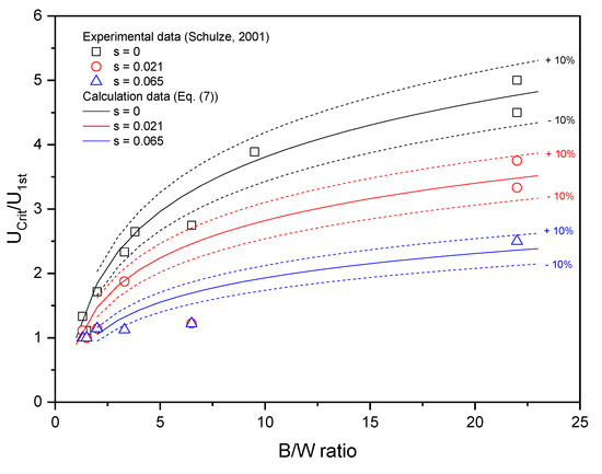 UCrit is the loss speed at which the oil can no longer be collected usually because of the instability of the boom. The previous study [44] has evaluated the effect of waves and the B/W ratio on the performance of the oil boom. The B/W is the ratio of the buoyancy and weight of the boom. Schulze [21] summarized experimental data on the planning, submergence, and splash-over loss speed of the boom. In this present study, the critical loss speed was correlated as a function of the wave steepness and the B/W ratio in order to quantify it, as shown in Figure 5. UCrit approaches U1st in poor conditions with high wave steepness, which indicates that critical losses can occur immediately. The decrease in UCrit is noticeable at B/W ratios of <10. In this study, the ratio of UCrit to U1st is correlated as a function of the boom specification and the environmental condition based on the test data [21], as shown in Equation (7).