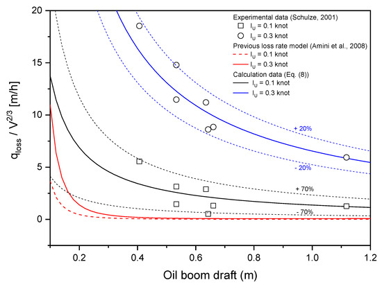 The loss rate model of Amini et al. [45] is only applicable for low-draft booms because the prototype boom in their experiment had drafts of 0.1 and 0.2 m. Therefore, as shown in Figure 4, their loss rate converges toward zero for drafts larger than 0.4 m. In contrast, the draft in the test data reported by Schulze [21] was larger than 0.4 m, which corresponds to the draft size of most practical oil booms. The data of Schulze [21] is, therefore, not directly compatible with the empirical equation proposed by Amini et al. [45].