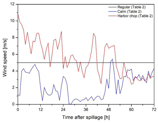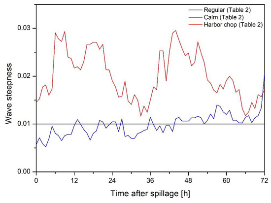 The case study featured three cases with different wave steepness values and wind speeds: regular, calm, and harbor chop. The calm and harbor chop environmental conditions were selected from data taken from the ocean observatory buoy of Port of Busan, hosted by the Korea Hydrographic and Oceanographic Agency (KHOA) [49], as shown in Table 2. The variations in wave steepness and wind speed are shown in Figure 7 and Figure 8, in association with the nonadjustable variables. Therefore, a total of nine cases considering three environmental conditions and three boom specifications were calculated to analyze the collecting potential using the variable loss rate-based recovery potential estimation model developed in this study.