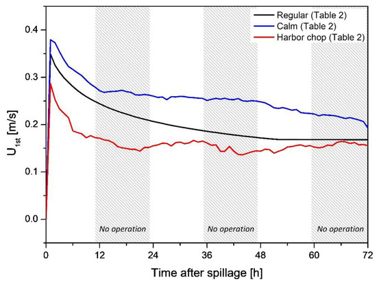 Figure 9 shows the calculated U1st over time for three environmental cases in Table 2. All three cases were calculated under the same equipment conditions (boom B in Table 1). Even though the type of oil and specification of the boom were both constant, U1st differed with time. This means that the density changes differed due to weathering and variations in wave steepness. While U1st oscillated over time in the case of calm conditions and harbor chop, during the regular case, it showed a monotonic decrease. This was accompanied with increasing density. The calculated results of U1st on the first day show that the high tow speed recovery operation can be applied without any loss of oil.