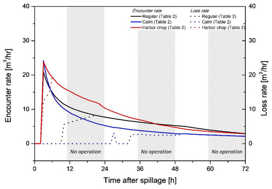 The encounter rate and loss rate, which reflect the difference between UTow (0.5 knots, constant) and U1st are shown in Figure 10. During the initial response time, each case had a high encounter rate because the spreading of the oil slick was limited. For the harbor chop case, in particular, the emulsion percentage was high due to weathering from the high wind speeds. Emulsion makes the oil slick thicker, which results in a higher encounter rate than the regular and calm cases. However, oil loss began to occur from the first day for the harbor chop case, unlike the calm case, and it eventually became equal to the encounter rate. This indicates how much oil is influenced by the UTow and can be used to determine how to adjust UTow in response to different environmental conditions.