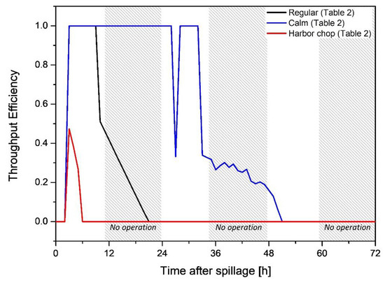 The TE in Figure 11 is a comprehensive value that includes a prior result of U1st, the encounter rate, and the loss rate. Additionally, TE indicated when the loss of oil began and indicated how much oil escaped from the encountered oil. The TE was ~0.5 early in the harbor chop case, before rapidly decreasing to zero. This implies that there were only a few hours on the first day where operation at 0.5 knots (0.257 m/s) tow speed was feasible. In the calm case, TE remained at one until the beginning of the second day but then suddenly decreased, which was related to the loss rate at that time. However, on the third day, the volume of oil encountered was much less than on the first and second days for all of the cases. These smaller encounter volumes mean that the volume of recoverable oil was also small. Therefore, from the quantitative perspective of recovery potential, care should be taken when interpreting the influence of TE over time.