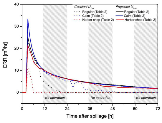 As shown in Figure 12, the ERR for a constant tow speed (0.5 knots, 0.257 m/s) and the proposed controlled tow speed, UTow, correspond to the calculated U1st values. In other words, ERR varied when the recovery system was being towed at the first critical speed. ERR was proportional to TE for constant UTow. The model estimated that ERR decreased continuously over time. For the case of the proposed controlled UTow, towing the mechanical recovery system can be applied by considering the maximum speed without oil loss, and TE was kept as 1. The ERR in the proposed UTow case was expected to be at its highest in the calm case during the first day. However, there was almost no difference in ERR across all of the cases during the second to third days because the oil slick thickness was accompanied by a high EnR, due to the emulsification of the regular and harbor chop case.