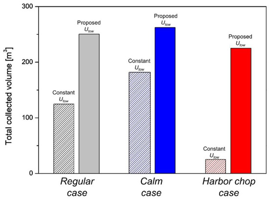 A comparison of the total collected volume of oil across the three days between the constant tow speed (0.5 knot) cases and proposed tow speed (U1st) cases is shown in Figure 13. The total collected volume is the cumulative value of the ERR, and it is the collecting potential considering TE. At a constant value of UTow, the value was lower in the harbor chop case because the volume of oil lost was highest during these severe environmental conditions. The difference in total collected volumes between the constant and proposed UTow cases is evident in the harbor chop case.