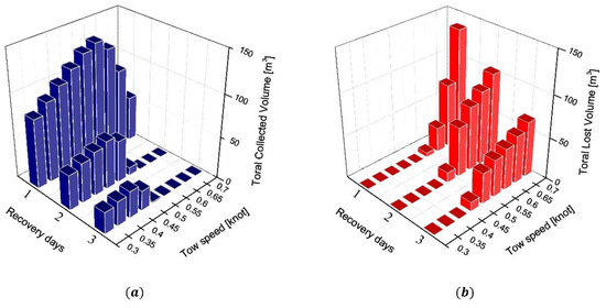 Figure 14 displays the total collected and lost volumes of oil when using boom B during the calm case, with a tow speed of 0.3–0.7 knots. Three conclusions can be drawn from the results of this case study. First, performance was greatest on the first day. Fresh, relatively unweathered oil is critical for the recovery system to operate. Therefore, UTow needed to be controlled to reduce oil loss, especially for the first day. Second, there was a value for UTow that represented the maximum recovery potential within the response time. This was 0.55 knots on the first day, which then decreased by 0.05 knots. This implies that UTow should be determined specifically for each day. Third, a UTow of 0.55 knots led to the best performance estimate on the first day even though there was oil loss during this time frame (Figure 14b). It is suggested that the best performance can be obtained with a fast UTow even though this may result in oil loss.