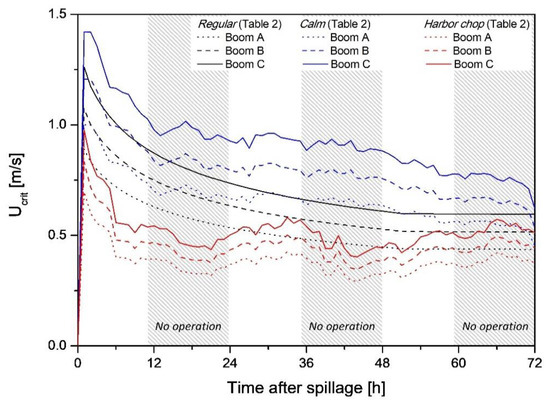 The B/W ratio does not determine the volume of the recovery potential, but is rather an estimate of whether the equipment can be used for the given environmental conditions. For the three boom cases (Table 1), Figure 15 shows variations in UCrit over time for the three different environmental conditions. UCrit was more dynamic than U1st over time, which should provide enough of a margin to utilize the boom. Even in the harbor chop case, the change in the range of UCrit when moving from boom A to boom C was more narrow than in the calm case. This implies that adjusting the boom B/W to avoid critical loss has a limited effect in severe environmental conditions, compared to that in calm conditions. Therefore, before calculating the volume of the recovery potential, countermeasures should be considered to achieve a desirable B/W by estimating UCrit in advance, particularly for poor environmental conditions.