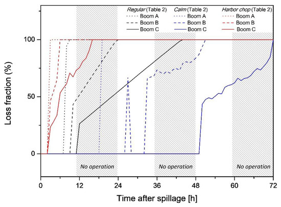 Loss fraction with a different boom type at a constant tow speed (0.5 knots) over spilled time: regular, calm, and harbor chop case (Table 2).