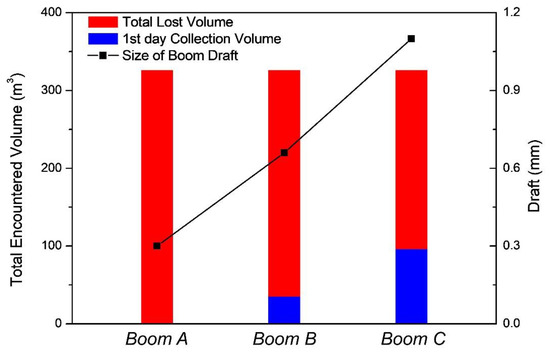 Figure 17 shows that, for the harbor chop case, changing the boom had a noticeable result on the first day’s collection volume. While boom A (0.3 m draft) lost all of the oil encountered, enlarging the draft size gradually improved the collection of oil. The collected volumes of booms B and C on the first day are shown in Figure 17.