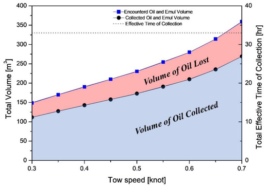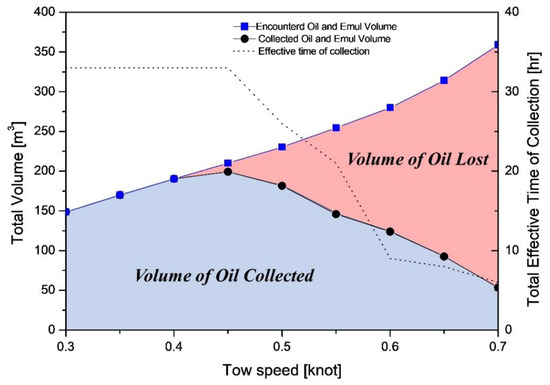 Comparison of the total volume of oil collected and effective time of collection using the variable loss rate model with a constant tow speed (calculation result by case 2 in Table 2).